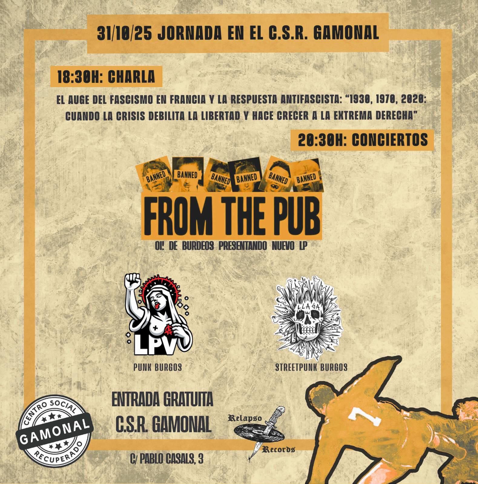 El próximo viernes 31 de octubre el Centro Social Recuperado de Gamonal acogerá el desarrollo de una jornada antifascista en la que hay programadas varias actividades. A partir de las 20:30 horas dará comienzo un concierto que contará con la presencia de las bandas burgalesas LPV y Llaga, con su característico estilo punk, para continuar con From the Pub, banda de estilo 0I! proveniente de Burdeos que, además, presentarán nuevo LP.