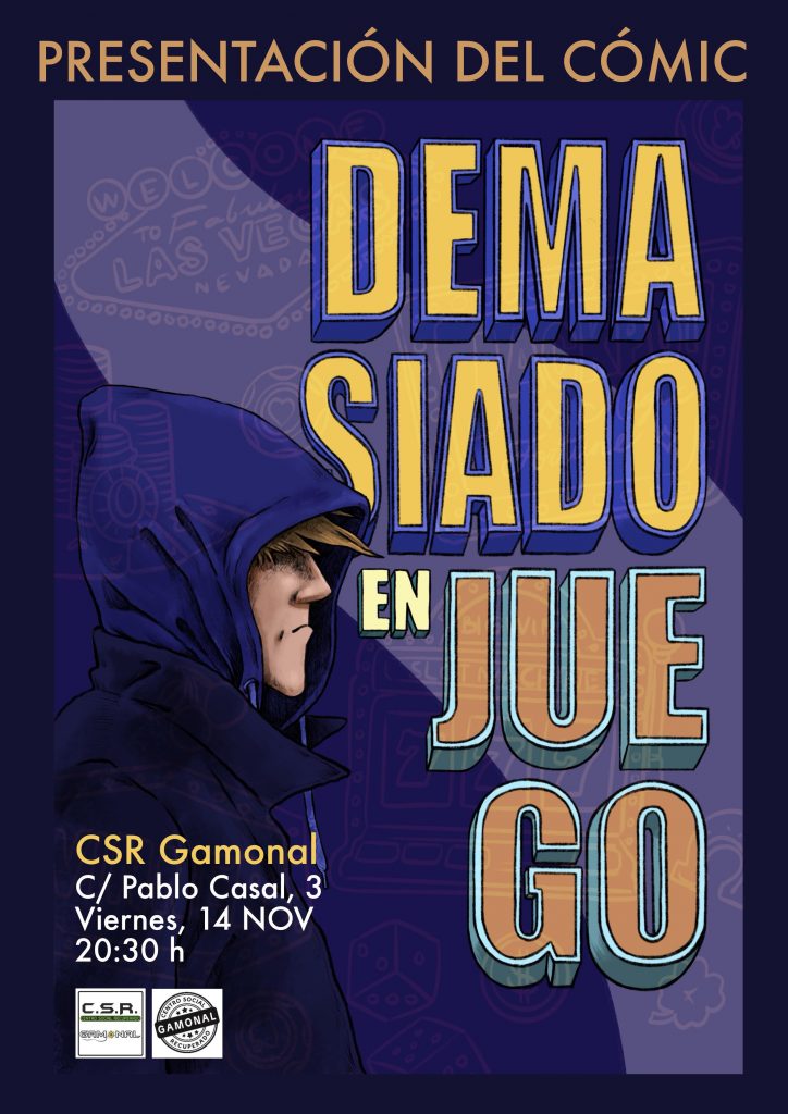 El próximo viernes, 14 de noviembre, el Centro Social Recuperado de Gamonal acogerá la presentación de Demasiado en juego, un breve cómic en formato grapa que aborda la problemática de la ludopatía juvenil con el trasfondo social de las protestas vecinales contra las salas de apuestas. La presentación, que dará comienzo a partir de las 20:30 horas, contará con la presencia de María de la Fuente (ilustración) y Sergio Izquierdo (guion), tándem creativo que hace años dio a luz Gamonal. En el eco de un mismo recuerdo, y que regresa de nuevo al mundo de la historieta con este tebeo que nos sumerge la espiral destructiva a la que se enfrentan las personas que padecen en sus carnes el infierno del juego patológico.