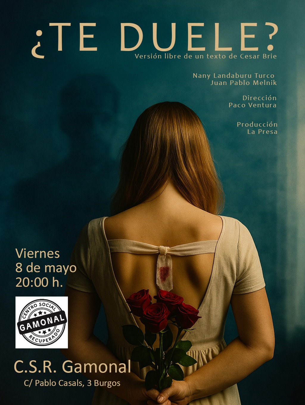 El viernes 8 de mayo tendrá lugar en el Centro Social Recuperado de Gamonal la representación de ¿Te duele? una producción teatral del colectivo “La Presa” dirigida por Paco Ventura e interpretada por Nany Landaburu Turco y Juan Pablo Melnik a partir de una adaptación libre de un texto de Cesar Brie. La actuación, que como siempre en el CSR Gamonal es de entrada libre y gratuita hasta completar el aforo, dará comienzo a las 20:00 horas y está planteada como “un poema amargo sobre lo que pasa demasiado a menudo entre los muros de las casas.»